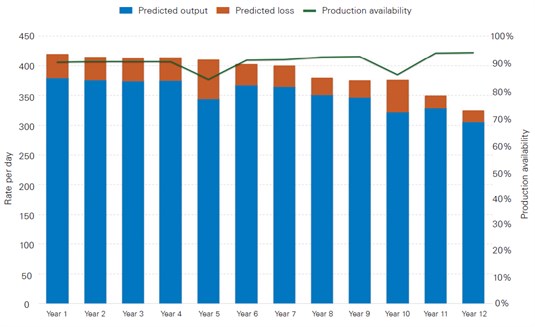 Consider a simple oil and gas production system that consists of two pumps, each required to operate at full capacity to accommodate the input and maximise output. If the simulation predicts failure of a pump in the first year, then the production rate through the system will temporarily halve for a period until the pump is fixed and reinstated. Eventual repair of the faulty pump may have a further impact on production unless it coincides with a planned maintenance outage. The reduction from full capacity in this case represents lost throughput and lost revenue.