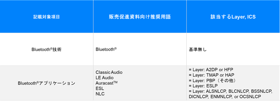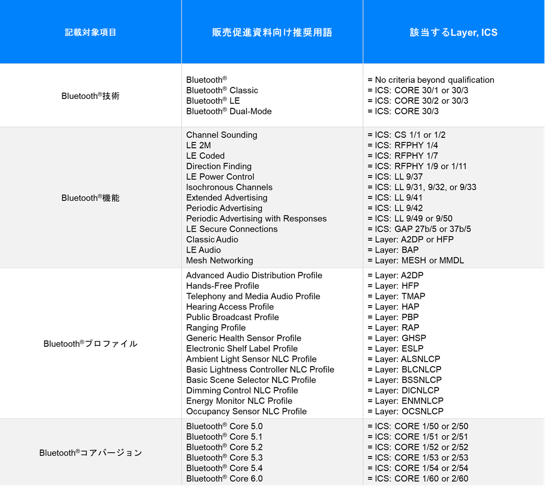 ICチップベンダーやモジュールベンダー等の会社向けには、コアバージョンやプロファイルを含めた具体的な仕様について記載する場合の指針が示されています。以下の通り、技術、機能、プロファイル、コアバージョン(Bluetooth® Core X.Y*)に分けた表記方法が推奨されています。(* X.Yは、仕様の版数を表します。)