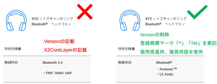 これからBluetooth®製品の販売を検討されている方は、表記方法の対象を「最終製品登録のメンバー向け」と「ICやモジュール等の開発者向け」に分けて考え、分かりやすく伝える表記方法をご検討下さい。
