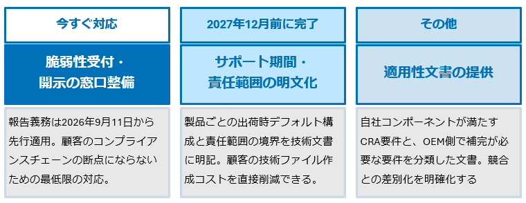 組込み供給型に該当するコンポーネントメーカーにとって、CRAによる直接的な対応義務はありませんが、OEMの要求に応える必要がでてくるケースもあります。 自社製品の上市形態を理解しておくことで、適切な対応の優先順位を設けることができます。