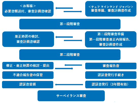 (1)申請、(1)文書審査、(3)第1段階審査、(4)第2段階審査、(5)審査結果のレビュー、(6)判定、(7)認証登録、(8)維持(サーベイランス審査)更新(再認証審査)