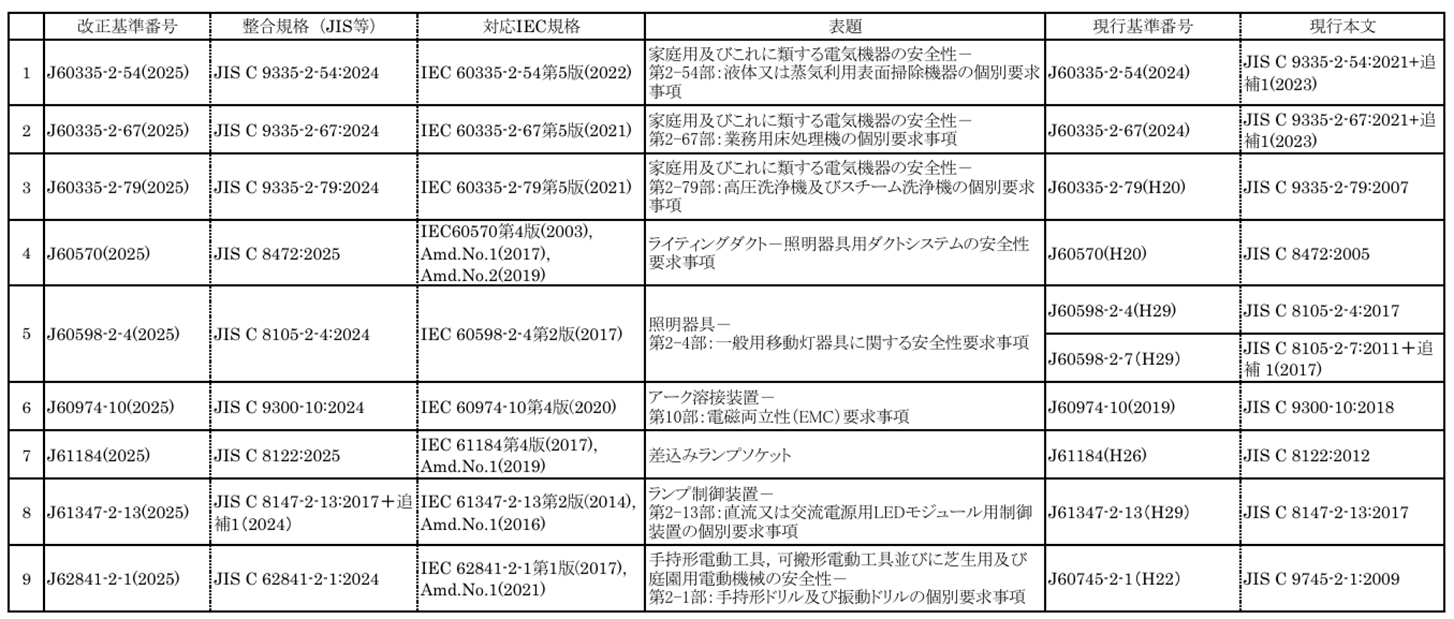 改正の概要は以下のとおりです。置き換える前のJIS規格の猶予期間につきましては、経済産業省 電気用品安全法のウェブサイト(トピックス:新旧対照表)の備考欄(改正案)をご参照ください。